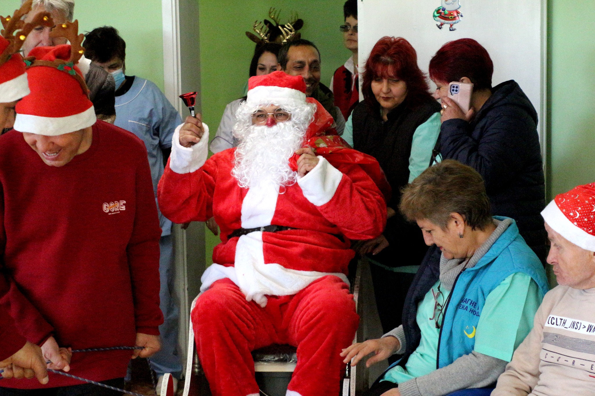 Мъжете от Дома изпяха с много артистичност и емоции различни коледни песни. С много добро настроение беше посрещнат Дядо Коледа, който пристигна в социалния Дом със специална шейна, теглена от джуджета. Коледари поздравиха гостите.